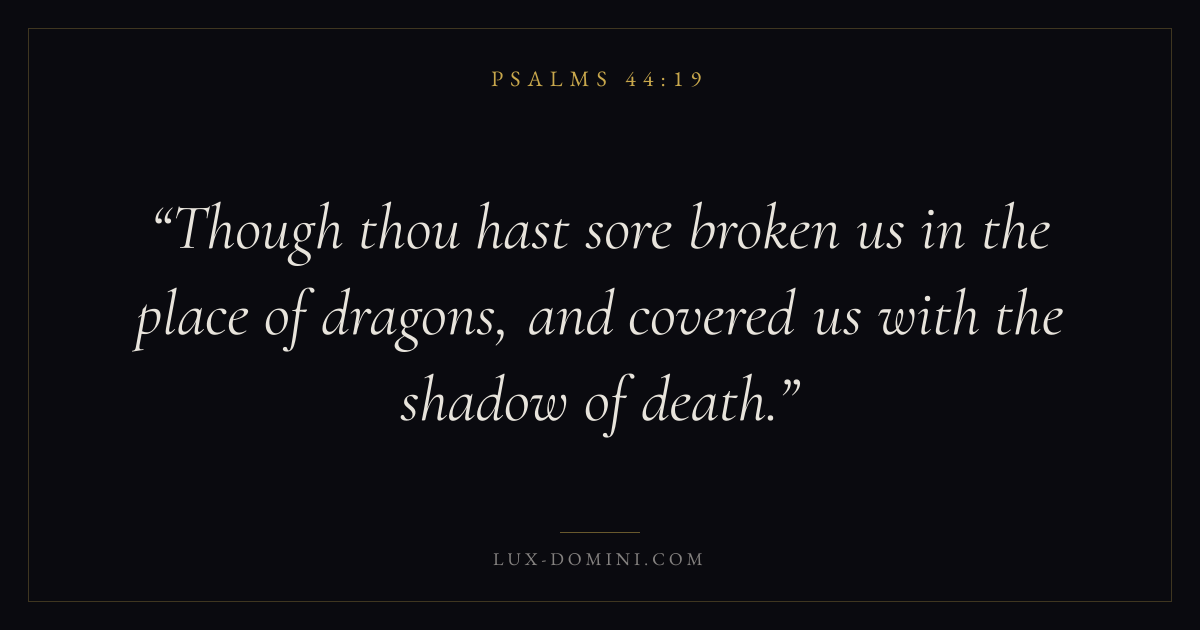 Books / Psalms / Chapter 44 / Verse 19 ← Psalms 44:18 Psalms 44:19 Psalms 44:20 → Though thou hast sore broken us in the place of dragons, and covered us with the shadow of death. Download verse card Share on Twitter Share on Facebook Pin it ✦ Key themes FaithPrayerWisdomTruthPraise Read with Hebrews 11:1Romans 10:17Matthew 6:9Luke 18:1 Related topics Bible verses about faithBible verses about prayerBible verses about wisdomBible verses about truthBible verses about thankfulness and gratitude ✦ Psalms Chapter 44 verses V. 1 V. 2 V. 3 V. 4 V. 5 V. 6 V. 7 V. 8 V. 9 V. 10 V. 11 V. 12 V. 13 V. 14 V. 15 V. 16 V. 17 V. 18 V. 19 V. 20 V. 21 V. 22 V. 23 V. 24 V. 25 V. 26