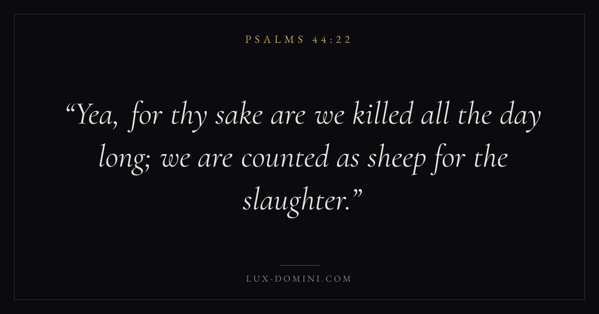 Books / Psalms / Chapter 44 / Verse 22 ← Psalms 44:21 Psalms 44:22 Psalms 44:23 → Yea, for thy sake are we killed all the day long; we are counted as sheep for the slaughter. Download verse card Share on Twitter Share on Facebook Pin it ✦ Key themes FaithPrayerWisdomTruthPraise Read with Hebrews 11:1Romans 10:17Matthew 6:9Luke 18:1 Related topics Bible verses about faithBible verses about prayerBible verses about wisdomBible verses about truthBible verses about thankfulness and gratitude ✦ Psalms Chapter 44 verses V. 1 V. 2 V. 3 V. 4 V. 5 V. 6 V. 7 V. 8 V. 9 V. 10 V. 11 V. 12 V. 13 V. 14 V. 15 V. 16 V. 17 V. 18 V. 19 V. 20 V. 21 V. 22 V. 23 V. 24 V. 25 V. 26
