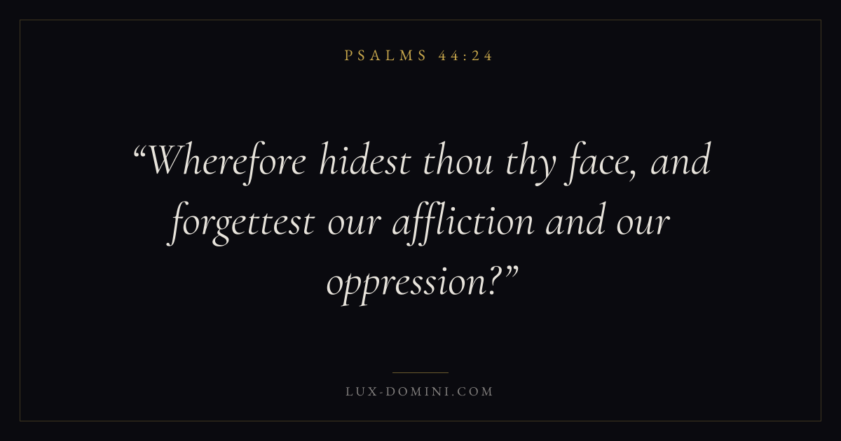 Books / Psalms / Chapter 44 / Verse 24 ← Psalms 44:23 Psalms 44:24 Psalms 44:25 → Wherefore hidest thou thy face, and forgettest our affliction and our oppression? Download verse card Share on Twitter Share on Facebook Pin it ✦ Key themes FaithSuffering and trialsPrayerWisdomPraise Read with Hebrews 11:1Romans 10:17Romans 8:182 Corinthians 4:17 Related topics Bible verses about faithBible verses about suffering and trialsBible verses about prayerBible verses about wisdomBible verses about thankfulness and gratitude ✦ Psalms Chapter 44 verses V. 1 V. 2 V. 3 V. 4 V. 5 V. 6 V. 7 V. 8 V. 9 V. 10 V. 11 V. 12 V. 13 V. 14 V. 15 V. 16 V. 17 V. 18 V. 19 V. 20 V. 21 V. 22 V. 23 V. 24 V. 25 V. 26