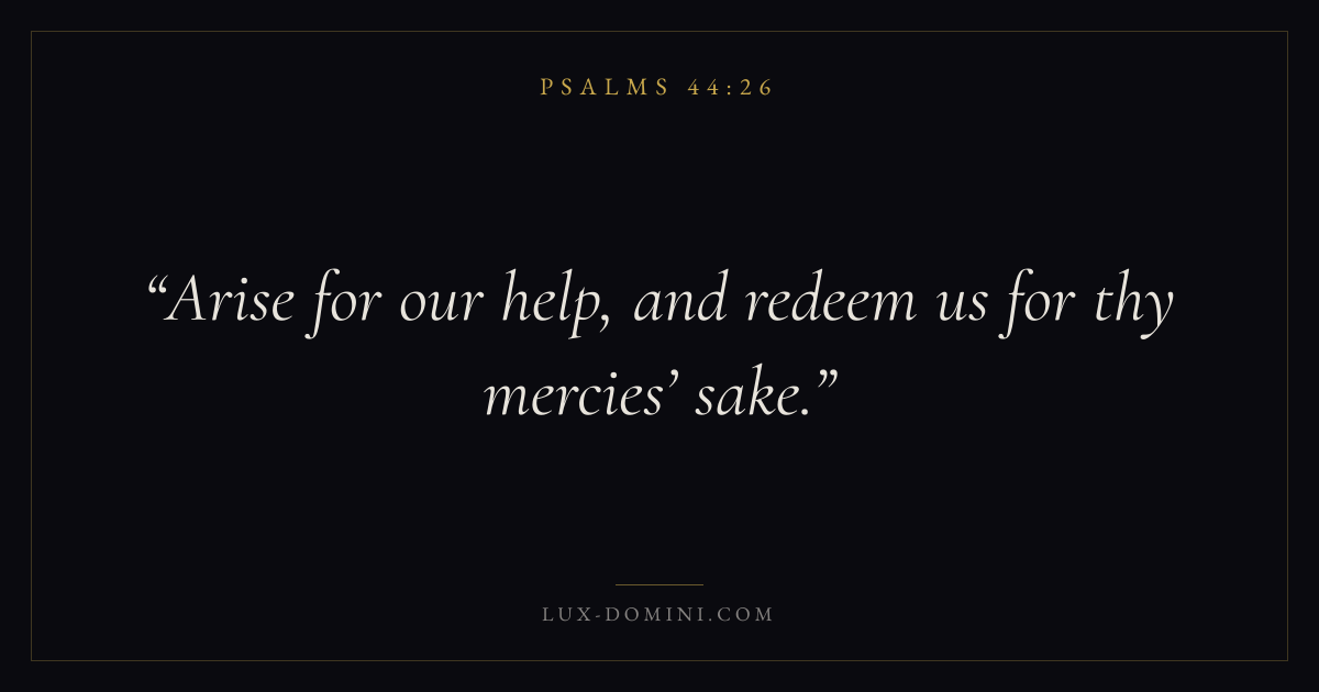 Books / Psalms / Chapter 44 / Verse 26 ← Psalms 44:25 Psalms 44:26 Psalms 45:1 → Arise for our help, and redeem us for thy mercies’ sake. Download verse card Share on Twitter Share on Facebook Pin it ✦ Key themes FaithPrayerWisdomSalvationPraise Read with Hebrews 11:1Romans 10:17Matthew 6:9Luke 18:1 Related topics Bible verses about faithBible verses about prayerBible verses about wisdomBible verses about salvationBible verses about thankfulness and gratitude ✦ Psalms Chapter 44 verses V. 1 V. 2 V. 3 V. 4 V. 5 V. 6 V. 7 V. 8 V. 9 V. 10 V. 11 V. 12 V. 13 V. 14 V. 15 V. 16 V. 17 V. 18 V. 19 V. 20 V. 21 V. 22 V. 23 V. 24 V. 25 V. 26