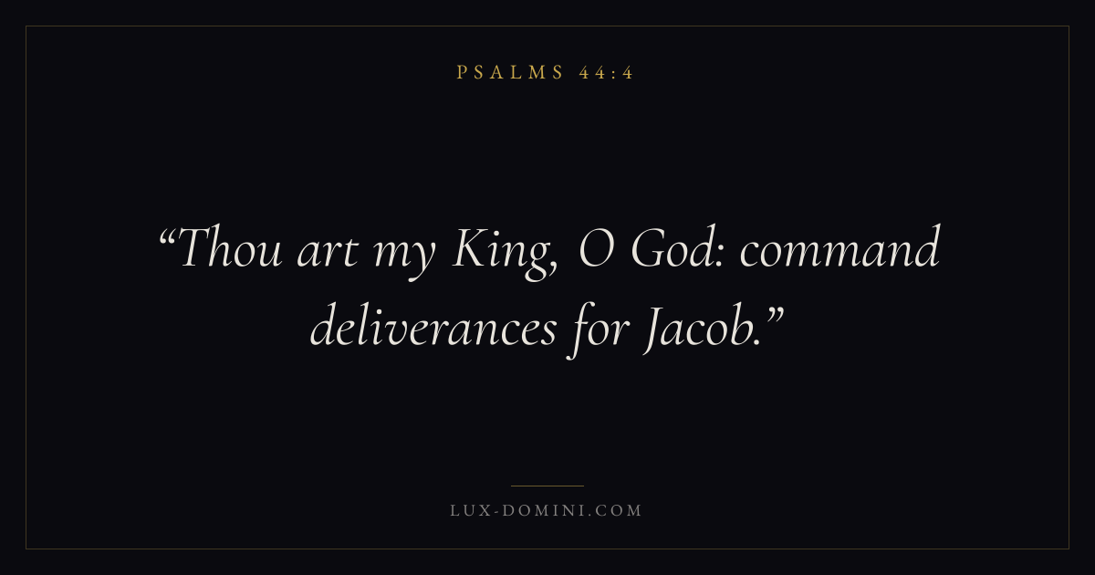 Books / Psalms / Chapter 44 / Verse 4 ← Psalms 44:3 Psalms 44:4 Psalms 44:5 → Thou art my King, O God: command deliverances for Jacob. Download verse card Share on Twitter Share on Facebook Pin it ✦ Key themes FaithPrayerGracePraise Read with Hebrews 11:1Romans 10:17Matthew 6:9Luke 18:1 Related topics Bible verses about faithBible verses about prayerBible verses about graceBible verses about thankfulness and gratitude ✦ Psalms Chapter 44 verses V. 1 V. 2 V. 3 V. 4 V. 5 V. 6 V. 7 V. 8 V. 9 V. 10 V. 11 V. 12 V. 13 V. 14 V. 15 V. 16 V. 17 V. 18 V. 19 V. 20 V. 21 V. 22 V. 23 V. 24 V. 25 V. 26