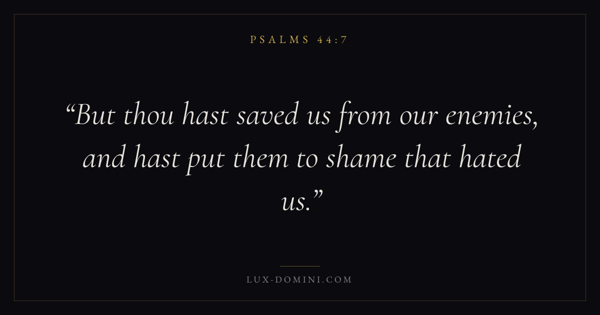 Books / Psalms / Chapter 44 / Verse 7 ← Psalms 44:6 Psalms 44:7 Psalms 44:8 → But thou hast saved us from our enemies, and hast put them to shame that hated us. Download verse card Share on Twitter Share on Facebook Pin it ✦ Key themes FaithPrayerSalvationGracePraise Read with Hebrews 11:1Romans 10:17Matthew 6:9Luke 18:1 Related topics Bible verses about faithBible verses about prayerBible verses about salvationBible verses about graceBible verses about thankfulness and gratitude ✦ Psalms Chapter 44 verses V. 1 V. 2 V. 3 V. 4 V. 5 V. 6 V. 7 V. 8 V. 9 V. 10 V. 11 V. 12 V. 13 V. 14 V. 15 V. 16 V. 17 V. 18 V. 19 V. 20 V. 21 V. 22 V. 23 V. 24 V. 25 V. 26