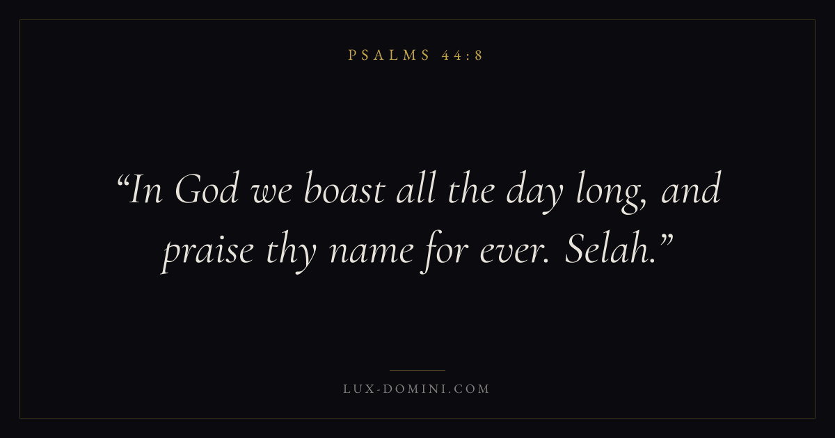 Books / Psalms / Chapter 44 / Verse 8 ← Psalms 44:7 Psalms 44:8 Psalms 44:9 → In God we boast all the day long, and praise thy name for ever. Selah. Download verse card Share on Twitter Share on Facebook Pin it ✦ Key themes FaithPrayerGracePraise Read with Hebrews 11:1Romans 10:17Matthew 6:9Luke 18:1 Related topics Bible verses about faithBible verses about prayerBible verses about graceBible verses about thankfulness and gratitude ✦ Psalms Chapter 44 verses V. 1 V. 2 V. 3 V. 4 V. 5 V. 6 V. 7 V. 8 V. 9 V. 10 V. 11 V. 12 V. 13 V. 14 V. 15 V. 16 V. 17 V. 18 V. 19 V. 20 V. 21 V. 22 V. 23 V. 24 V. 25 V. 26