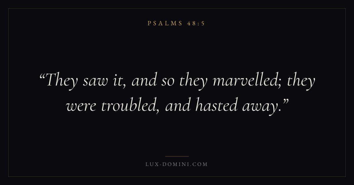 Books / Psalms / Chapter 48 / Verse 5 ← Psalms 48:4 Psalms 48:5 Psalms 48:6 → They saw it, and so they marvelled; they were troubled, and hasted away. Download verse card Share on Twitter Share on Facebook Pin it ✦ Key themes FaithAnxiety and fearPrayerPraise Read with Hebrews 11:1Romans 10:17Philippians 4:6Isaiah 41:10 Related topics Bible verses about faithBible verses about anxiety and fearBible verses about prayerBible verses about thankfulness and gratitude ✦ Psalms Chapter 48 verses V. 1 V. 2 V. 3 V. 4 V. 5 V. 6 V. 7 V. 8 V. 9 V. 10 V. 11 V. 12 V. 13 V. 14