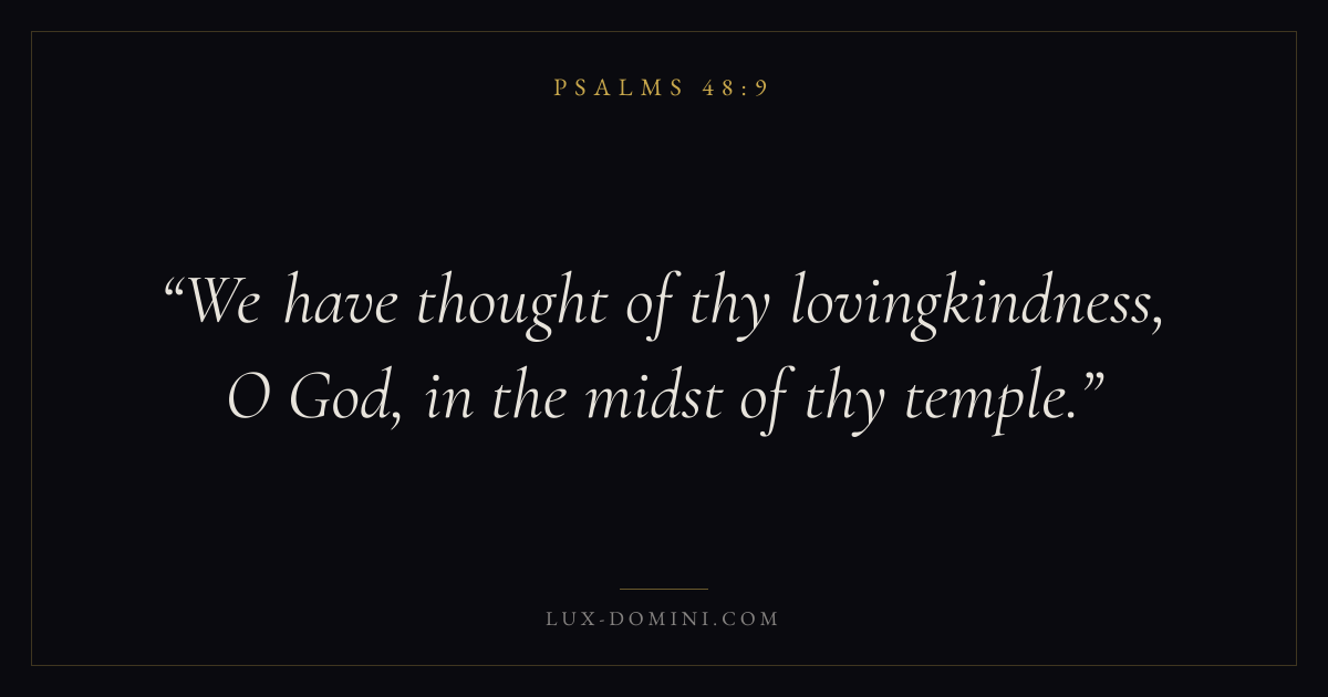 Books / Psalms / Chapter 48 / Verse 9 ← Psalms 48:8 Psalms 48:9 Psalms 48:10 → We have thought of thy lovingkindness, O God, in the midst of thy temple. Download verse card Share on Twitter Share on Facebook Pin it ✦ Key themes FaithPrayerGraceTruthPraise Read with Hebrews 11:1Romans 10:17Matthew 6:9Luke 18:1 Related topics Bible verses about faithBible verses about prayerBible verses about graceBible verses about truthBible verses about thankfulness and gratitude ✦ Psalms Chapter 48 verses V. 1 V. 2 V. 3 V. 4 V. 5 V. 6 V. 7 V. 8 V. 9 V. 10 V. 11 V. 12 V. 13 V. 14