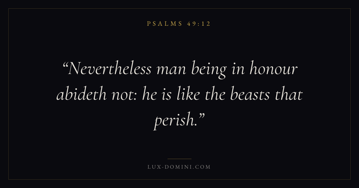Books / Psalms / Chapter 49 / Verse 12 ← Psalms 49:11 Psalms 49:12 Psalms 49:13 → Nevertheless man being in honour abideth not: he is like the beasts that perish. Download verse card Share on Twitter Share on Facebook Pin it ✦ Key themes LoveFaithPrayerPraise Read with John 3:161 Corinthians 13:4Hebrews 11:1Romans 10:17 Related topics Bible verses about loveBible verses about faithBible verses about prayerBible verses about thankfulness and gratitude ✦ Psalms Chapter 49 verses V. 1 V. 2 V. 3 V. 4 V. 5 V. 6 V. 7 V. 8 V. 9 V. 10 V. 11 V. 12 V. 13 V. 14 V. 15 V. 16 V. 17 V. 18 V. 19 V. 20