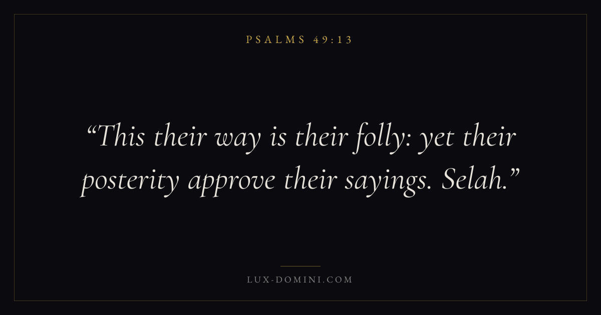 Books / Psalms / Chapter 49 / Verse 13 ← Psalms 49:12 Psalms 49:13 Psalms 49:14 → This their way is their folly: yet their posterity approve their sayings. Selah. Download verse card Share on Twitter Share on Facebook Pin it ✦ Key themes LoveFaithPrayerPraise Read with John 3:161 Corinthians 13:4Hebrews 11:1Romans 10:17 Related topics Bible verses about loveBible verses about faithBible verses about prayerBible verses about thankfulness and gratitude ✦ Psalms Chapter 49 verses V. 1 V. 2 V. 3 V. 4 V. 5 V. 6 V. 7 V. 8 V. 9 V. 10 V. 11 V. 12 V. 13 V. 14 V. 15 V. 16 V. 17 V. 18 V. 19 V. 20