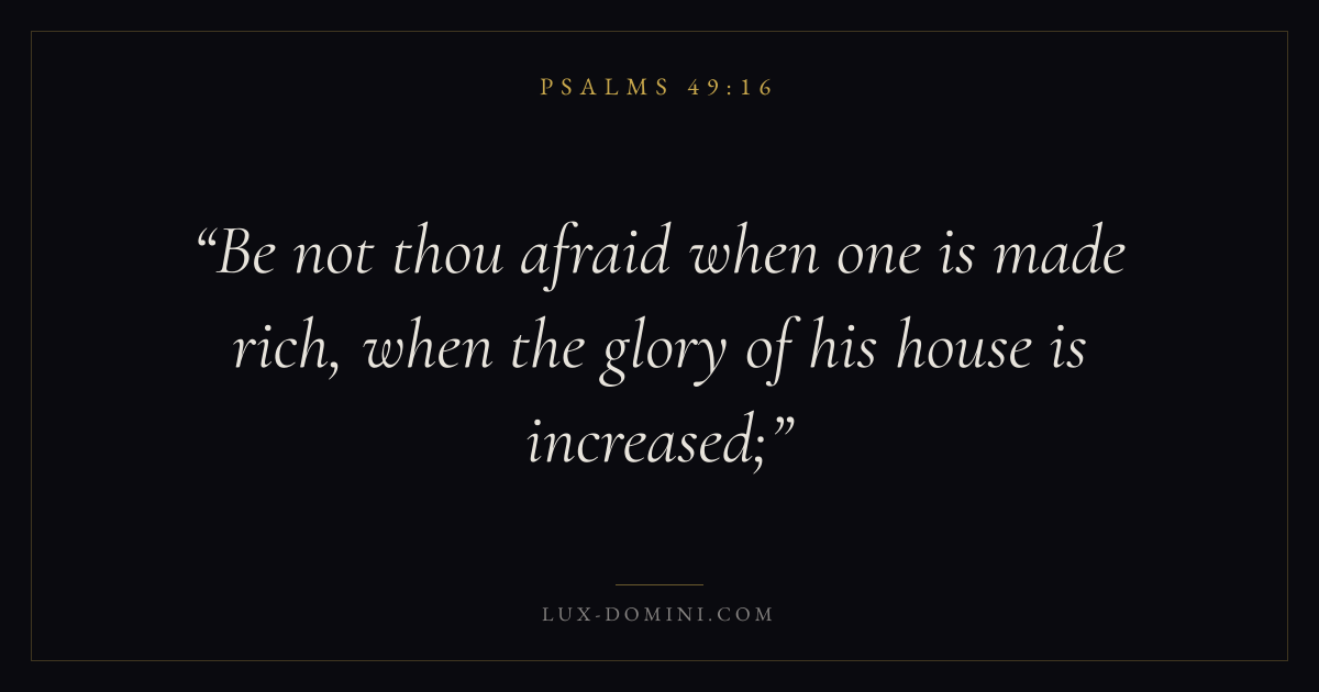 Books / Psalms / Chapter 49 / Verse 16 ← Psalms 49:15 Psalms 49:16 Psalms 49:17 → Be not thou afraid when one is made rich, when the glory of his house is increased; Download verse card Share on Twitter Share on Facebook Pin it ✦ Key themes FaithAnxiety and fearPrayerPraise Read with Hebrews 11:1Romans 10:17Philippians 4:6Isaiah 41:10 Related topics Bible verses about faithBible verses about anxiety and fearBible verses about prayerBible verses about thankfulness and gratitude ✦ Psalms Chapter 49 verses V. 1 V. 2 V. 3 V. 4 V. 5 V. 6 V. 7 V. 8 V. 9 V. 10 V. 11 V. 12 V. 13 V. 14 V. 15 V. 16 V. 17 V. 18 V. 19 V. 20