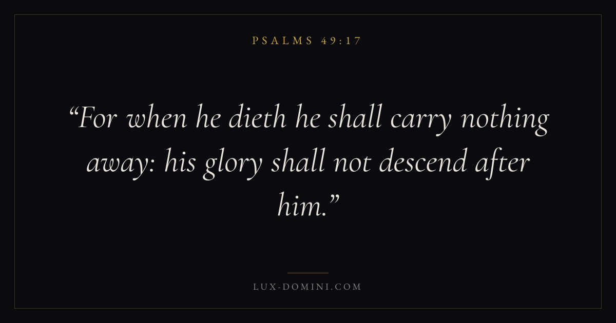 Books / Psalms / Chapter 49 / Verse 17 ← Psalms 49:16 Psalms 49:17 Psalms 49:18 → For when he dieth he shall carry nothing away: his glory shall not descend after him. Download verse card Share on Twitter Share on Facebook Pin it ✦ Key themes FaithAnxiety and fearPrayerPraise Read with Hebrews 11:1Romans 10:17Philippians 4:6Isaiah 41:10 Related topics Bible verses about faithBible verses about anxiety and fearBible verses about prayerBible verses about thankfulness and gratitude ✦ Psalms Chapter 49 verses V. 1 V. 2 V. 3 V. 4 V. 5 V. 6 V. 7 V. 8 V. 9 V. 10 V. 11 V. 12 V. 13 V. 14 V. 15 V. 16 V. 17 V. 18 V. 19 V. 20
