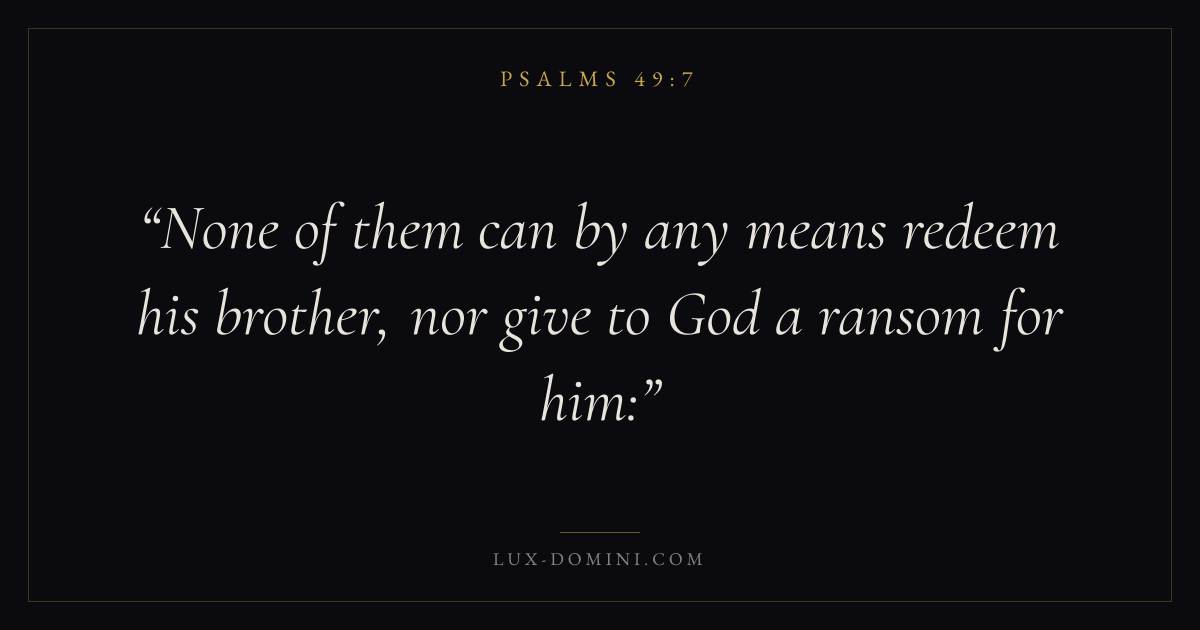 Books / Psalms / Chapter 49 / Verse 7 ← Psalms 49:6 Psalms 49:7 Psalms 49:8 → None of them can by any means redeem his brother, nor give to God a ransom for him: Download verse card Share on Twitter Share on Facebook Pin it ✦ Key themes LoveFaithPrayerSalvationPraise Read with John 3:161 Corinthians 13:4Hebrews 11:1Romans 10:17 Related topics Bible verses about loveBible verses about faithBible verses about prayerBible verses about salvationBible verses about thankfulness and gratitude ✦ Psalms Chapter 49 verses V. 1 V. 2 V. 3 V. 4 V. 5 V. 6 V. 7 V. 8 V. 9 V. 10 V. 11 V. 12 V. 13 V. 14 V. 15 V. 16 V. 17 V. 18 V. 19 V. 20