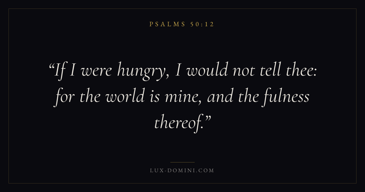 Books / Psalms / Chapter 50 / Verse 12 ← Psalms 50:11 Psalms 50:12 Psalms 50:13 → If I were hungry, I would not tell thee: for the world is mine, and the fulness thereof. Download verse card Share on Twitter Share on Facebook Pin it ✦ Key themes LoveFaithPrayerPeacePraise Read with John 3:161 Corinthians 13:4Hebrews 11:1Romans 10:17 Related topics Bible verses about loveBible verses about faithBible verses about prayerBible verses about peaceBible verses about thankfulness and gratitude ✦ Psalms Chapter 50 verses V. 1 V. 2 V. 3 V. 4 V. 5 V. 6 V. 7 V. 8 V. 9 V. 10 V. 11 V. 12 V. 13 V. 14 V. 15 V. 16 V. 17 V. 18 V. 19 V. 20 V. 21 V. 22 V. 23