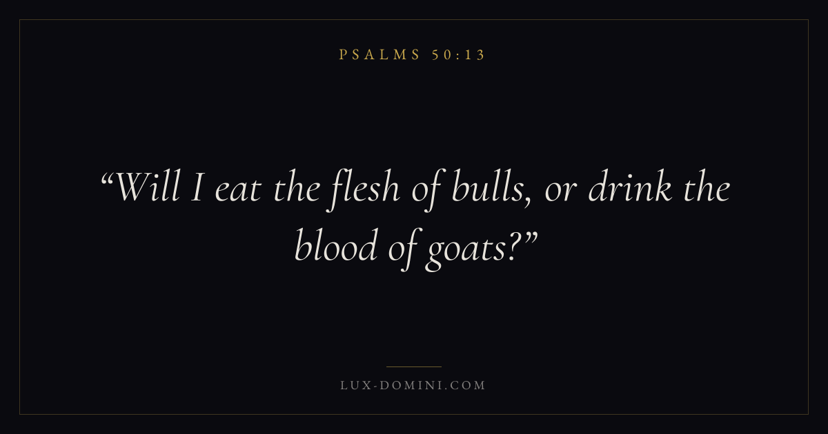 Books / Psalms / Chapter 50 / Verse 13 ← Psalms 50:12 Psalms 50:13 Psalms 50:14 → Will I eat the flesh of bulls, or drink the blood of goats? Download verse card Share on Twitter Share on Facebook Pin it ✦ Key themes LoveFaithPrayerPeacePraise Read with John 3:161 Corinthians 13:4Hebrews 11:1Romans 10:17 Related topics Bible verses about loveBible verses about faithBible verses about prayerBible verses about peaceBible verses about thankfulness and gratitude ✦ Psalms Chapter 50 verses V. 1 V. 2 V. 3 V. 4 V. 5 V. 6 V. 7 V. 8 V. 9 V. 10 V. 11 V. 12 V. 13 V. 14 V. 15 V. 16 V. 17 V. 18 V. 19 V. 20 V. 21 V. 22 V. 23