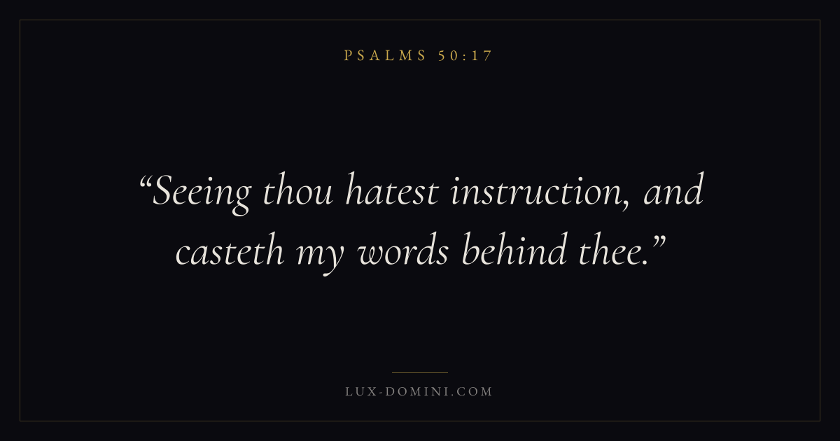 Books / Psalms / Chapter 50 / Verse 17 ← Psalms 50:16 Psalms 50:17 Psalms 50:18 → Seeing thou hatest instruction, and casteth my words behind thee. Download verse card Share on Twitter Share on Facebook Pin it ✦ Key themes FaithPrayerJustice and mercyPraise Read with Hebrews 11:1Romans 10:17Matthew 6:9Luke 18:1 Related topics Bible verses about faithBible verses about prayerBible verses about justice and mercyBible verses about thankfulness and gratitude ✦ Psalms Chapter 50 verses V. 1 V. 2 V. 3 V. 4 V. 5 V. 6 V. 7 V. 8 V. 9 V. 10 V. 11 V. 12 V. 13 V. 14 V. 15 V. 16 V. 17 V. 18 V. 19 V. 20 V. 21 V. 22 V. 23