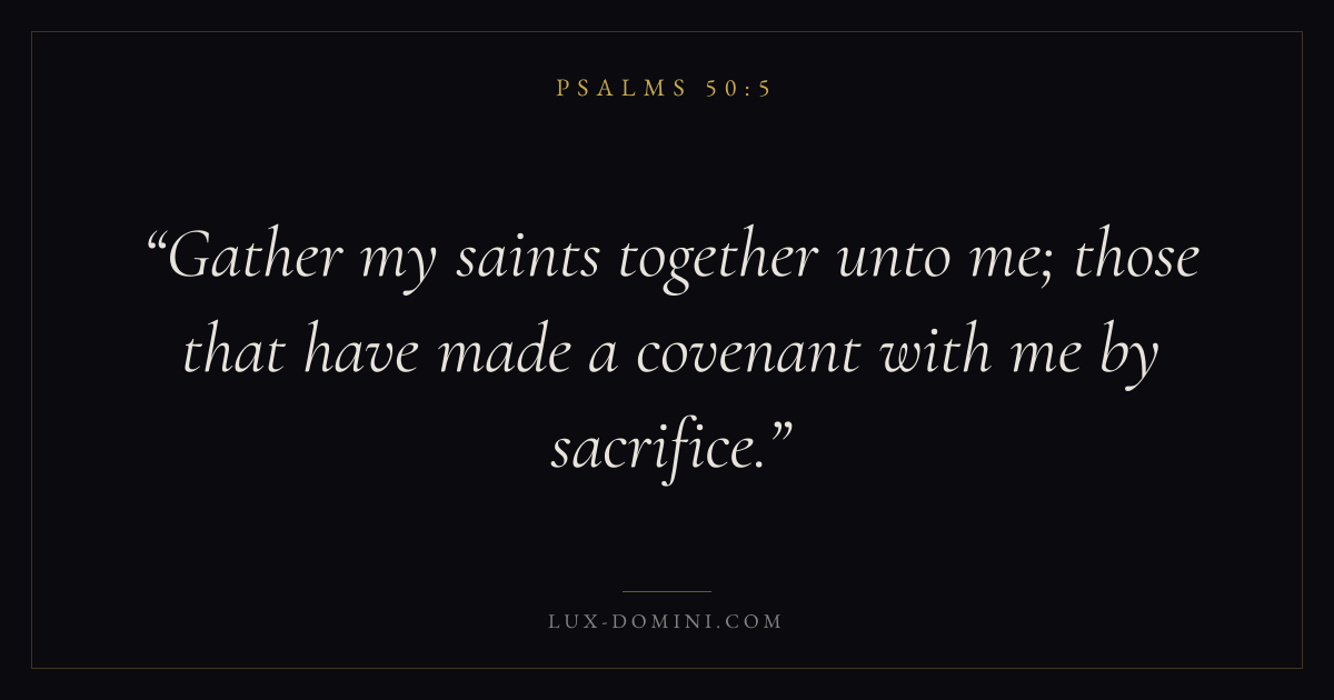 Books / Psalms / Chapter 50 / Verse 5 ← Psalms 50:4 Psalms 50:5 Psalms 50:6 → Gather my saints together unto me; those that have made a covenant with me by sacrifice. Download verse card Share on Twitter Share on Facebook Pin it ✦ Key themes FaithPrayerJustice and mercyPraise Read with Hebrews 11:1Romans 10:17Matthew 6:9Luke 18:1 Related topics Bible verses about faithBible verses about prayerBible verses about justice and mercyBible verses about thankfulness and gratitude ✦ Psalms Chapter 50 verses V. 1 V. 2 V. 3 V. 4 V. 5 V. 6 V. 7 V. 8 V. 9 V. 10 V. 11 V. 12 V. 13 V. 14 V. 15 V. 16 V. 17 V. 18 V. 19 V. 20 V. 21 V. 22 V. 23
