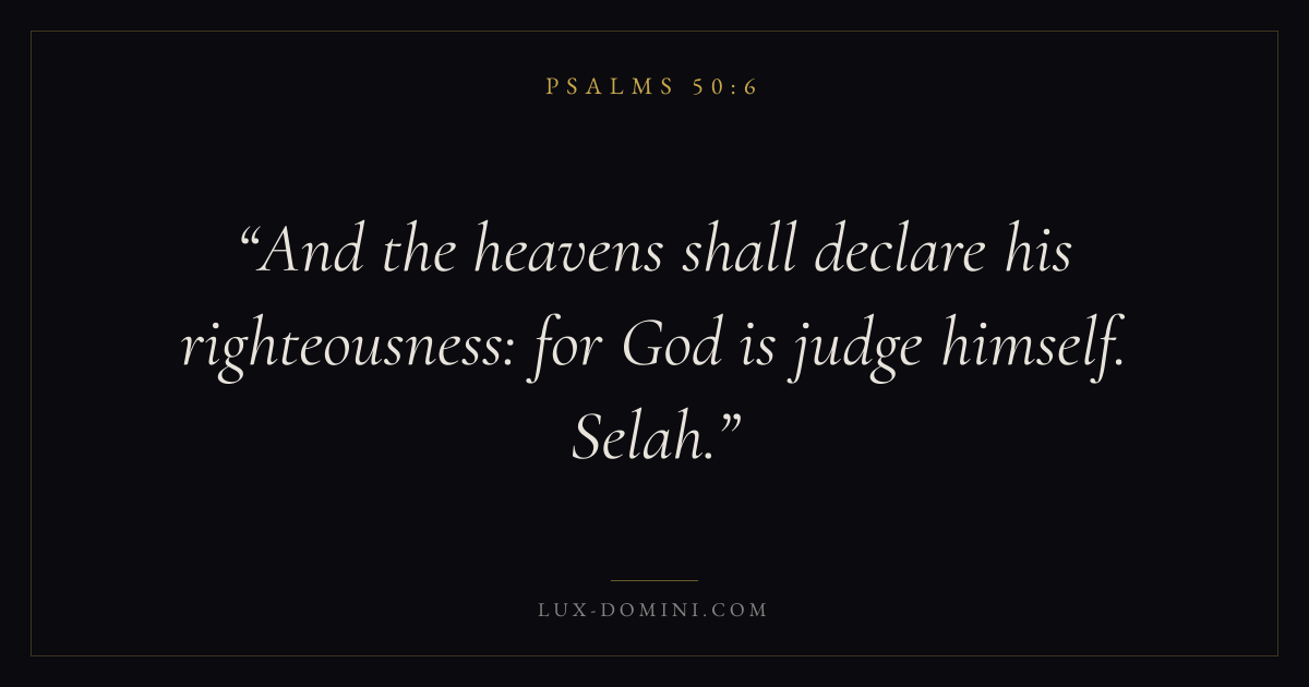 Books / Psalms / Chapter 50 / Verse 6 ← Psalms 50:5 Psalms 50:6 Psalms 50:7 → And the heavens shall declare his righteousness: for God is judge himself. Selah. Download verse card Share on Twitter Share on Facebook Pin it ✦ Key themes FaithPrayerJustice and mercyPraise Read with Hebrews 11:1Romans 10:17Matthew 6:9Luke 18:1 Related topics Bible verses about faithBible verses about prayerBible verses about justice and mercyBible verses about thankfulness and gratitude ✦ Psalms Chapter 50 verses V. 1 V. 2 V. 3 V. 4 V. 5 V. 6 V. 7 V. 8 V. 9 V. 10 V. 11 V. 12 V. 13 V. 14 V. 15 V. 16 V. 17 V. 18 V. 19 V. 20 V. 21 V. 22 V. 23