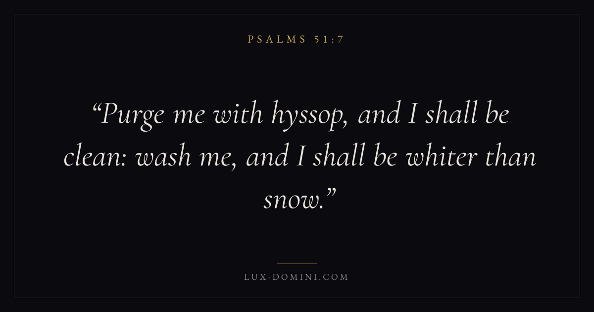 Books / Psalms / Chapter 51 / Verse 7 ← Psalms 51:6 Psalms 51:7 Psalms 51:8 → Purge me with hyssop, and I shall be clean: wash me, and I shall be whiter than snow. Download verse card Share on Twitter Share on Facebook Pin it ✦ Key themes FaithPrayerPraiseLament Read with Hebrews 11:1Romans 10:17Matthew 6:9Luke 18:1 Related topics Bible verses about faithBible verses about prayerBible verses about thankfulness and gratitudeBible verses about grief and loss ✦ Psalms Chapter 51 verses V. 1 V. 2 V. 3 V. 4 V. 5 V. 6 V. 7 V. 8 V. 9 V. 10 V. 11 V. 12 V. 13 V. 14 V. 15 V. 16 V. 17 V. 18 V. 19