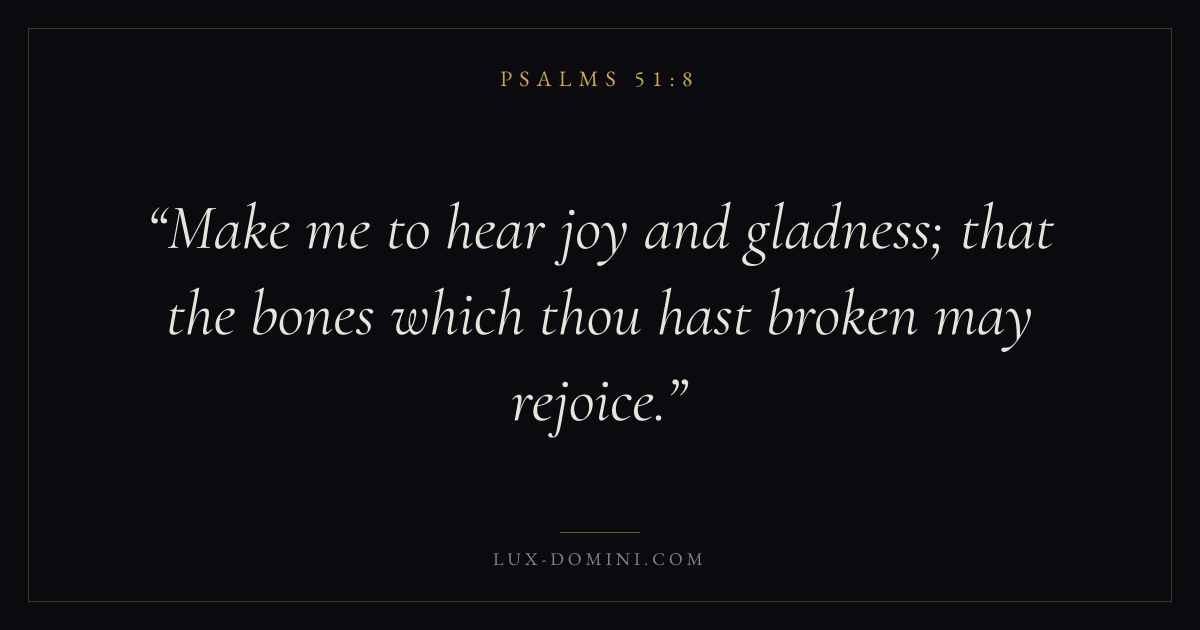 Books / Psalms / Chapter 51 / Verse 8 ← Psalms 51:7 Psalms 51:8 Psalms 51:9 → Make me to hear joy and gladness; that the bones which thou hast broken may rejoice. Download verse card Share on Twitter Share on Facebook Pin it ✦ Key themes FaithPrayerPraiseLament Read with Hebrews 11:1Romans 10:17Matthew 6:9Luke 18:1 Related topics Bible verses about faithBible verses about prayerBible verses about thankfulness and gratitudeBible verses about grief and loss ✦ Psalms Chapter 51 verses V. 1 V. 2 V. 3 V. 4 V. 5 V. 6 V. 7 V. 8 V. 9 V. 10 V. 11 V. 12 V. 13 V. 14 V. 15 V. 16 V. 17 V. 18 V. 19