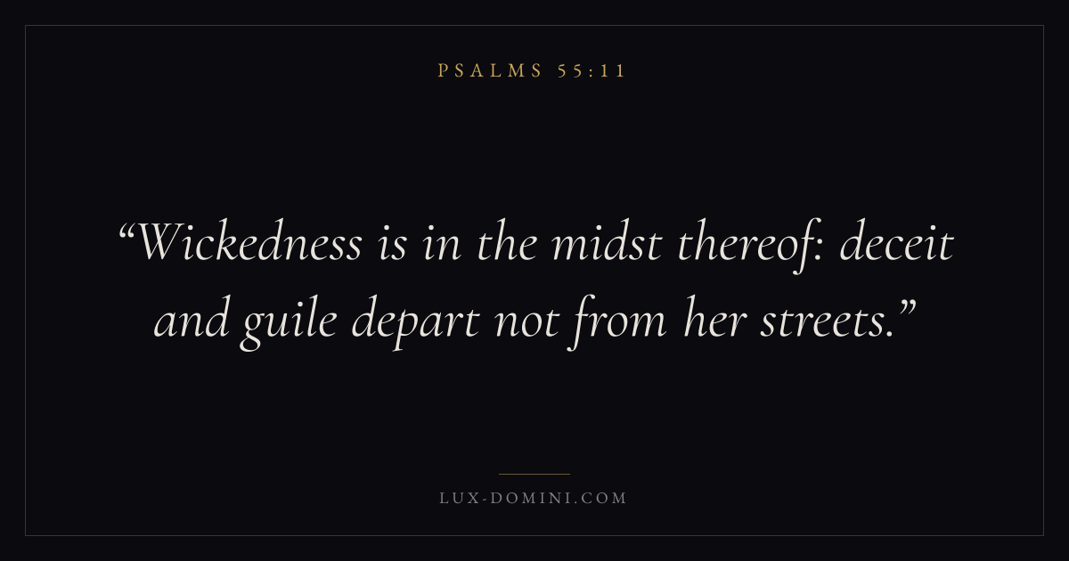 Books / Psalms / Chapter 55 / Verse 11 ← Psalms 55:10 Psalms 55:11 Psalms 55:12 → Wickedness is in the midst thereof: deceit and guile depart not from her streets. Download verse card Share on Twitter Share on Facebook Pin it ✦ Key themes FaithPrayerPraiseLament Read with Hebrews 11:1Romans 10:17Matthew 6:9Luke 18:1 Related topics Bible verses about faithBible verses about prayerBible verses about thankfulness and gratitudeBible verses about grief and loss ✦ Psalms Chapter 55 verses V. 1 V. 2 V. 3 V. 4 V. 5 V. 6 V. 7 V. 8 V. 9 V. 10 V. 11 V. 12 V. 13 V. 14 V. 15 V. 16 V. 17 V. 18 V. 19 V. 20 V. 21 V. 22 V. 23