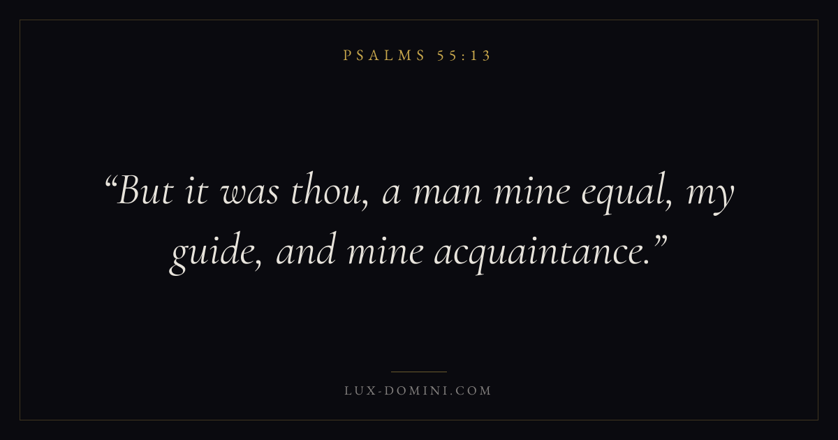 Books / Psalms / Chapter 55 / Verse 13 ← Psalms 55:12 Psalms 55:13 Psalms 55:14 → But it was thou, a man mine equal, my guide, and mine acquaintance. Download verse card Share on Twitter Share on Facebook Pin it ✦ Key themes FaithPrayerPraiseLament Read with Hebrews 11:1Romans 10:17Matthew 6:9Luke 18:1 Related topics Bible verses about faithBible verses about prayerBible verses about thankfulness and gratitudeBible verses about grief and loss ✦ Psalms Chapter 55 verses V. 1 V. 2 V. 3 V. 4 V. 5 V. 6 V. 7 V. 8 V. 9 V. 10 V. 11 V. 12 V. 13 V. 14 V. 15 V. 16 V. 17 V. 18 V. 19 V. 20 V. 21 V. 22 V. 23