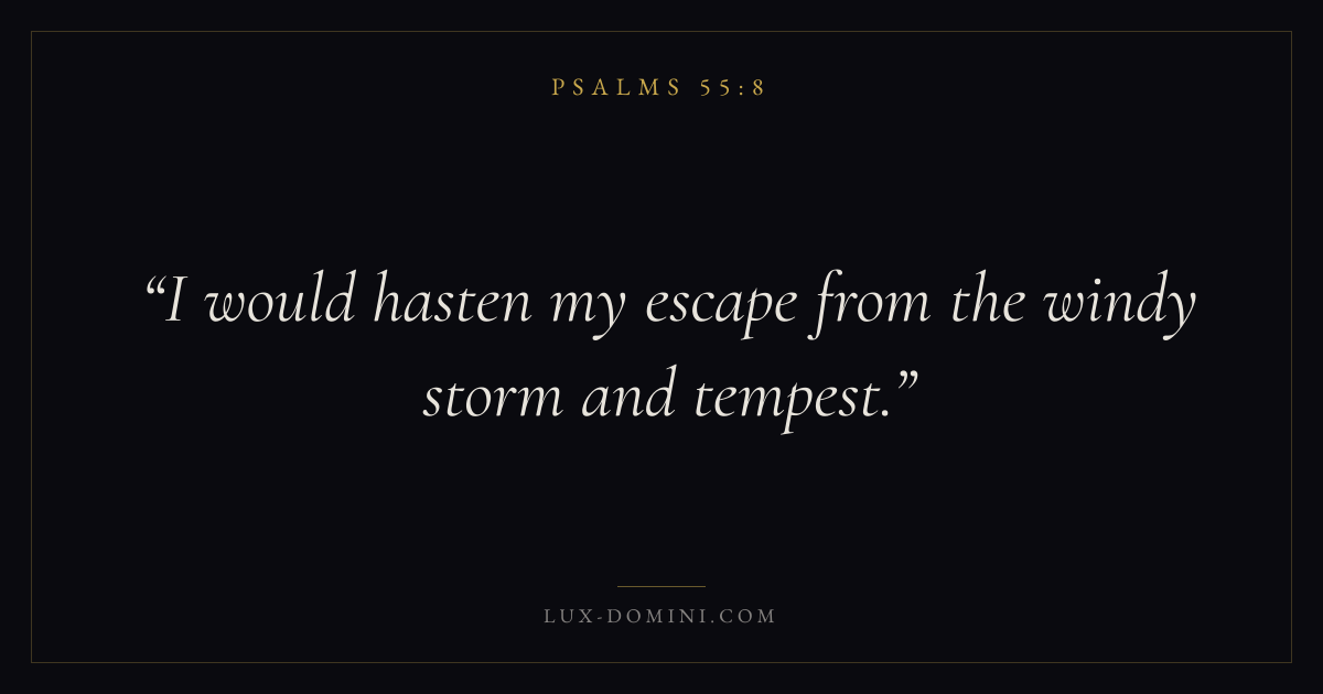 Books / Psalms / Chapter 55 / Verse 8 ← Psalms 55:7 Psalms 55:8 Psalms 55:9 → I would hasten my escape from the windy storm and tempest. Download verse card Share on Twitter Share on Facebook Pin it ✦ Key themes FaithPrayerPraiseLament Read with Hebrews 11:1Romans 10:17Matthew 6:9Luke 18:1 Related topics Bible verses about faithBible verses about prayerBible verses about thankfulness and gratitudeBible verses about grief and loss ✦ Psalms Chapter 55 verses V. 1 V. 2 V. 3 V. 4 V. 5 V. 6 V. 7 V. 8 V. 9 V. 10 V. 11 V. 12 V. 13 V. 14 V. 15 V. 16 V. 17 V. 18 V. 19 V. 20 V. 21 V. 22 V. 23