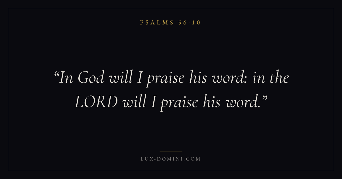 Books / Psalms / Chapter 56 / Verse 10 ← Psalms 56:9 Psalms 56:10 Psalms 56:11 → In God will I praise his word: in the LORD will I praise his word. Download verse card Share on Twitter Share on Facebook Pin it ✦ Key themes FaithPrayerTruthPraise Read with Hebrews 11:1Romans 10:17Matthew 6:9Luke 18:1 Related topics Bible verses about faithBible verses about prayerBible verses about truthBible verses about thankfulness and gratitude ✦ Psalms Chapter 56 verses V. 1 V. 2 V. 3 V. 4 V. 5 V. 6 V. 7 V. 8 V. 9 V. 10 V. 11 V. 12 V. 13
