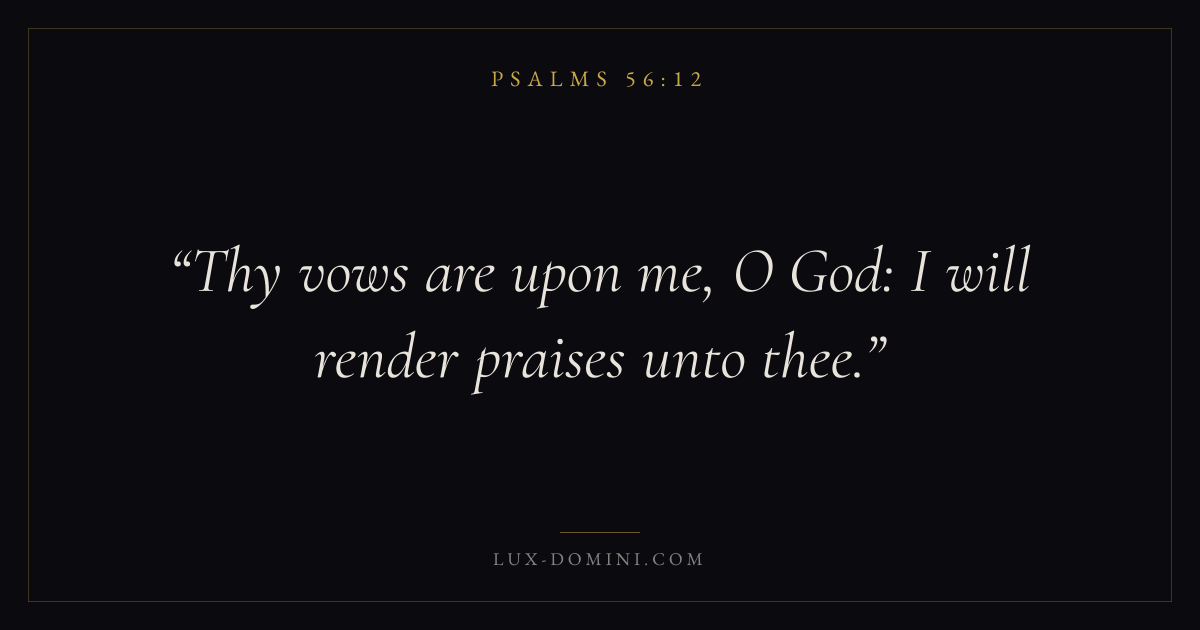 Books / Psalms / Chapter 56 / Verse 12 ← Psalms 56:11 Psalms 56:12 Psalms 56:13 → Thy vows are upon me, O God: I will render praises unto thee. Download verse card Share on Twitter Share on Facebook Pin it ✦ Key themes FaithPrayerPraiseLament Read with Hebrews 11:1Romans 10:17Matthew 6:9Luke 18:1 Related topics Bible verses about faithBible verses about prayerBible verses about thankfulness and gratitudeBible verses about grief and loss ✦ Psalms Chapter 56 verses V. 1 V. 2 V. 3 V. 4 V. 5 V. 6 V. 7 V. 8 V. 9 V. 10 V. 11 V. 12 V. 13