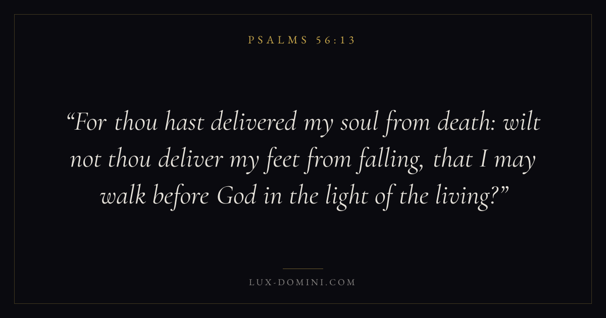 For thou hast delivered my soul from death: wilt not thou deliver my feet from falling, that I may walk before God in the light of the living?