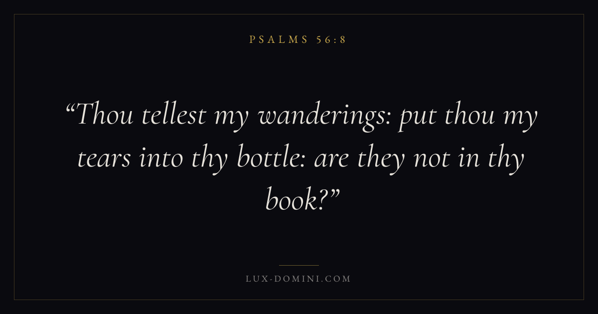 Books / Psalms / Chapter 56 / Verse 8 ← Psalms 56:7 Psalms 56:8 Psalms 56:9 → Thou tellest my wanderings: put thou my tears into thy bottle: are they not in thy book? Download verse card Share on Twitter Share on Facebook Pin it ✦ Key themes FaithSuffering and trialsPrayerPraise Read with Hebrews 11:1Romans 10:17Romans 8:182 Corinthians 4:17 Related topics Bible verses about faithBible verses about suffering and trialsBible verses about prayerBible verses about thankfulness and gratitude ✦ Psalms Chapter 56 verses V. 1 V. 2 V. 3 V. 4 V. 5 V. 6 V. 7 V. 8 V. 9 V. 10 V. 11 V. 12 V. 13