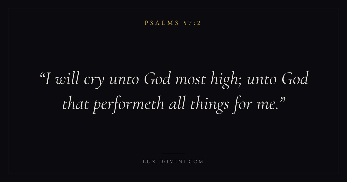 Books / Psalms / Chapter 57 / Verse 2 ← Psalms 57:1 Psalms 57:2 Psalms 57:3 → I will cry unto God most high; unto God that performeth all things for me. Download verse card Share on Twitter Share on Facebook Pin it ✦ Key themes FaithPrayerJustice and mercyPraise Read with Hebrews 11:1Romans 10:17Matthew 6:9Luke 18:1 Related topics Bible verses about faithBible verses about prayerBible verses about justice and mercyBible verses about thankfulness and gratitude ✦ Psalms Chapter 57 verses V. 1 V. 2 V. 3 V. 4 V. 5 V. 6 V. 7 V. 8 V. 9 V. 10 V. 11