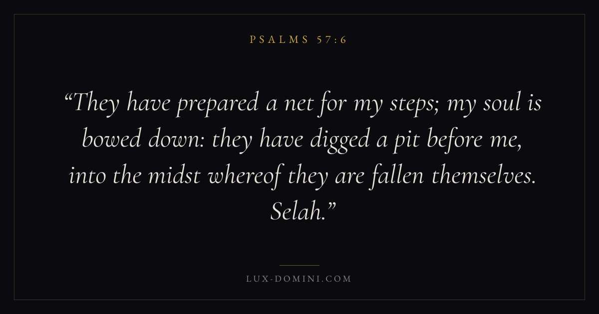 They have prepared a net for my steps; my soul is bowed down: they have digged a pit before me, into the midst whereof they are fallen themselves. Selah.