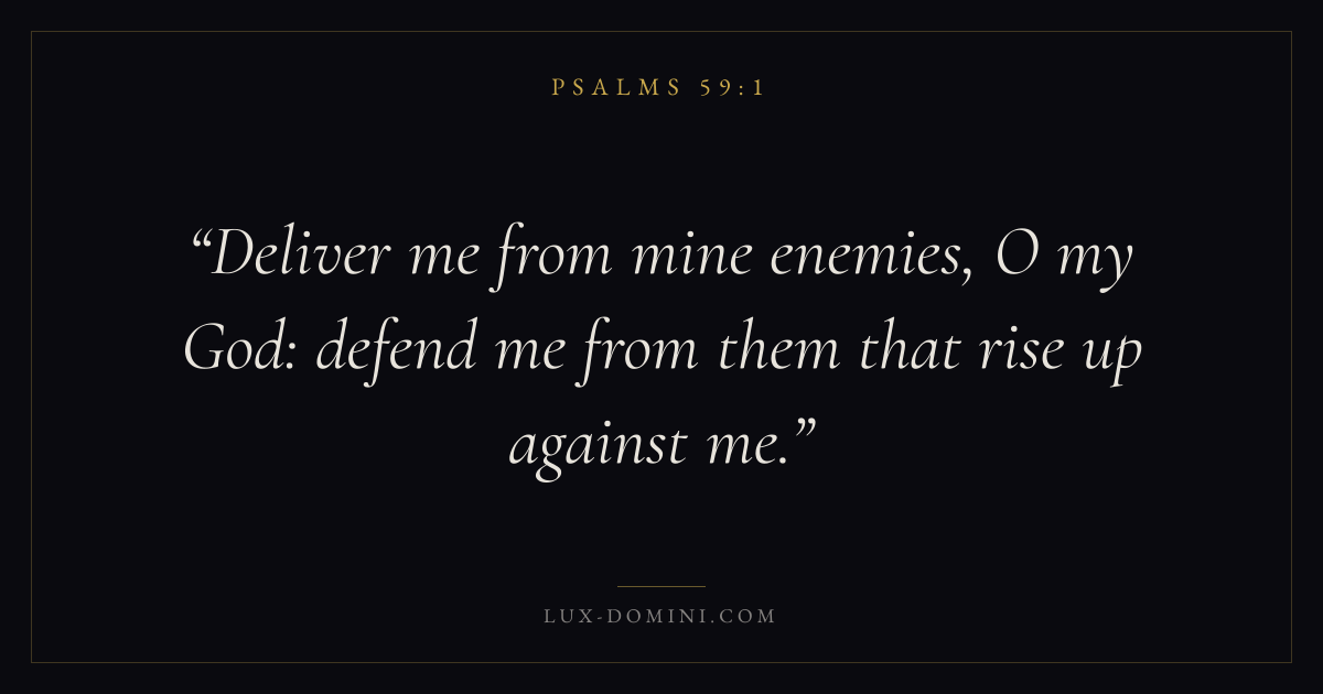 Books / Psalms / Chapter 59 / Verse 1 ← Psalms 58:11 Psalms 59:1 Psalms 59:2 → Deliver me from mine enemies, O my God: defend me from them that rise up against me. Download verse card Share on Twitter Share on Facebook Pin it ✦ Key themes FaithSuffering and trialsPrayerPraise Read with Hebrews 11:1Romans 10:17Romans 8:182 Corinthians 4:17 Related topics Bible verses about faithBible verses about suffering and trialsBible verses about prayerBible verses about thankfulness and gratitude ✦ Psalms Chapter 59 verses V. 1 V. 2 V. 3 V. 4 V. 5 V. 6 V. 7 V. 8 V. 9 V. 10 V. 11 V. 12 V. 13 V. 14 V. 15 V. 16 V. 17