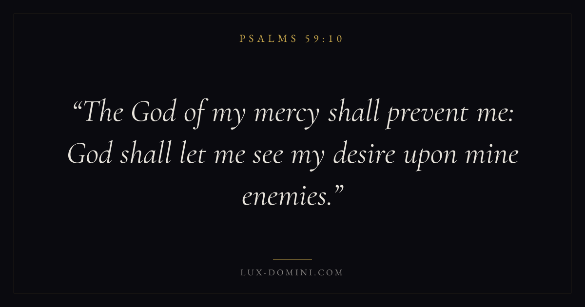 Books / Psalms / Chapter 59 / Verse 10 ← Psalms 59:9 Psalms 59:10 Psalms 59:11 → The God of my mercy shall prevent me: God shall let me see my desire upon mine enemies. Download verse card Share on Twitter Share on Facebook Pin it ✦ Key themes FaithHopePrayerWisdomPraise Read with Hebrews 11:1Romans 10:17Romans 8:24Revelation 21:4 Related topics Bible verses about faithBible verses about hopeBible verses about prayerBible verses about wisdomBible verses about thankfulness and gratitude ✦ Psalms Chapter 59 verses V. 1 V. 2 V. 3 V. 4 V. 5 V. 6 V. 7 V. 8 V. 9 V. 10 V. 11 V. 12 V. 13 V. 14 V. 15 V. 16 V. 17