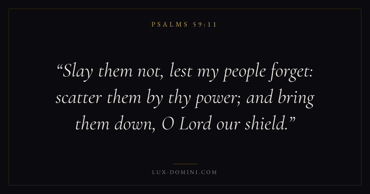 Slay them not, lest my people forget: scatter them by thy power; and bring them down, O Lord our shield.