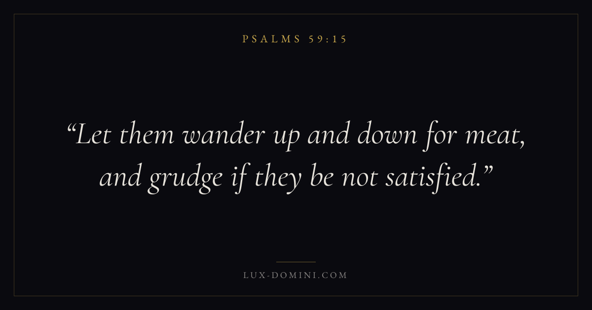 Books / Psalms / Chapter 59 / Verse 15 ← Psalms 59:14 Psalms 59:15 Psalms 59:16 → Let them wander up and down for meat, and grudge if they be not satisfied. Download verse card Share on Twitter Share on Facebook Pin it ✦ Key themes FaithHopePrayerWisdomPraise Read with Hebrews 11:1Romans 10:17Romans 8:24Revelation 21:4 Related topics Bible verses about faithBible verses about hopeBible verses about prayerBible verses about wisdomBible verses about thankfulness and gratitude ✦ Psalms Chapter 59 verses V. 1 V. 2 V. 3 V. 4 V. 5 V. 6 V. 7 V. 8 V. 9 V. 10 V. 11 V. 12 V. 13 V. 14 V. 15 V. 16 V. 17