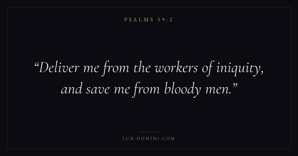 Books / Psalms / Chapter 59 / Verse 2 ← Psalms 59:1 Psalms 59:2 Psalms 59:3 → Deliver me from the workers of iniquity, and save me from bloody men. Download verse card Share on Twitter Share on Facebook Pin it ✦ Key themes FaithSuffering and trialsPrayerSalvationPraise Read with Hebrews 11:1Romans 10:17Romans 8:182 Corinthians 4:17 Related topics Bible verses about faithBible verses about suffering and trialsBible verses about prayerBible verses about salvationBible verses about thankfulness and gratitude ✦ Psalms Chapter 59 verses V. 1 V. 2 V. 3 V. 4 V. 5 V. 6 V. 7 V. 8 V. 9 V. 10 V. 11 V. 12 V. 13 V. 14 V. 15 V. 16 V. 17