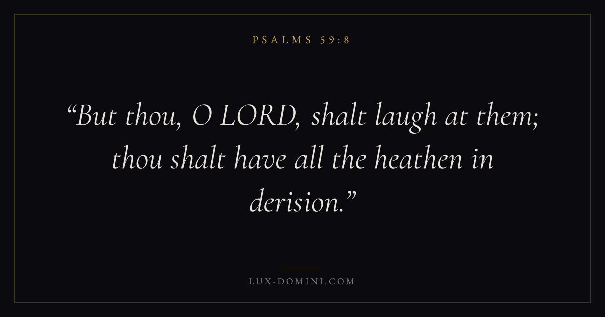 Books / Psalms / Chapter 59 / Verse 8 ← Psalms 59:7 Psalms 59:8 Psalms 59:9 → But thou, O LORD, shalt laugh at them; thou shalt have all the heathen in derision. Download verse card Share on Twitter Share on Facebook Pin it ✦ Key themes FaithHopePrayerWisdomPraise Read with Hebrews 11:1Romans 10:17Romans 8:24Revelation 21:4 Related topics Bible verses about faithBible verses about hopeBible verses about prayerBible verses about wisdomBible verses about thankfulness and gratitude ✦ Psalms Chapter 59 verses V. 1 V. 2 V. 3 V. 4 V. 5 V. 6 V. 7 V. 8 V. 9 V. 10 V. 11 V. 12 V. 13 V. 14 V. 15 V. 16 V. 17