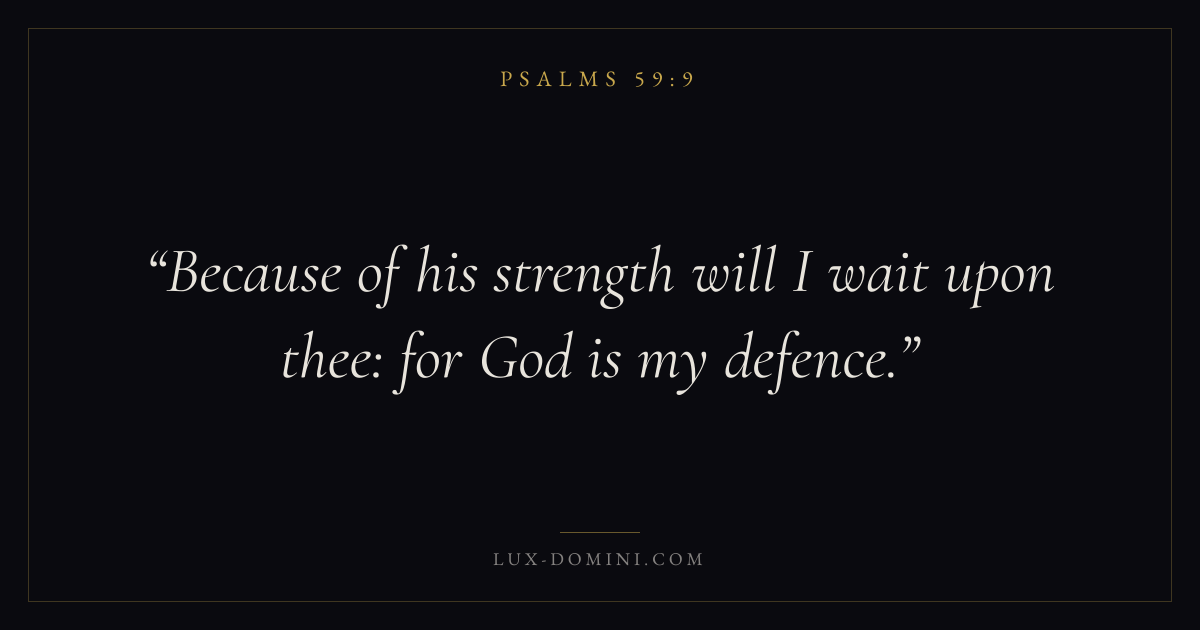 Books / Psalms / Chapter 59 / Verse 9 ← Psalms 59:8 Psalms 59:9 Psalms 59:10 → Because of his strength will I wait upon thee: for God is my defence. Download verse card Share on Twitter Share on Facebook Pin it ✦ Key themes FaithHopePrayerWisdomPraise Read with Hebrews 11:1Romans 10:17Romans 8:24Revelation 21:4 Related topics Bible verses about faithBible verses about hopeBible verses about prayerBible verses about wisdomBible verses about thankfulness and gratitude ✦ Psalms Chapter 59 verses V. 1 V. 2 V. 3 V. 4 V. 5 V. 6 V. 7 V. 8 V. 9 V. 10 V. 11 V. 12 V. 13 V. 14 V. 15 V. 16 V. 17