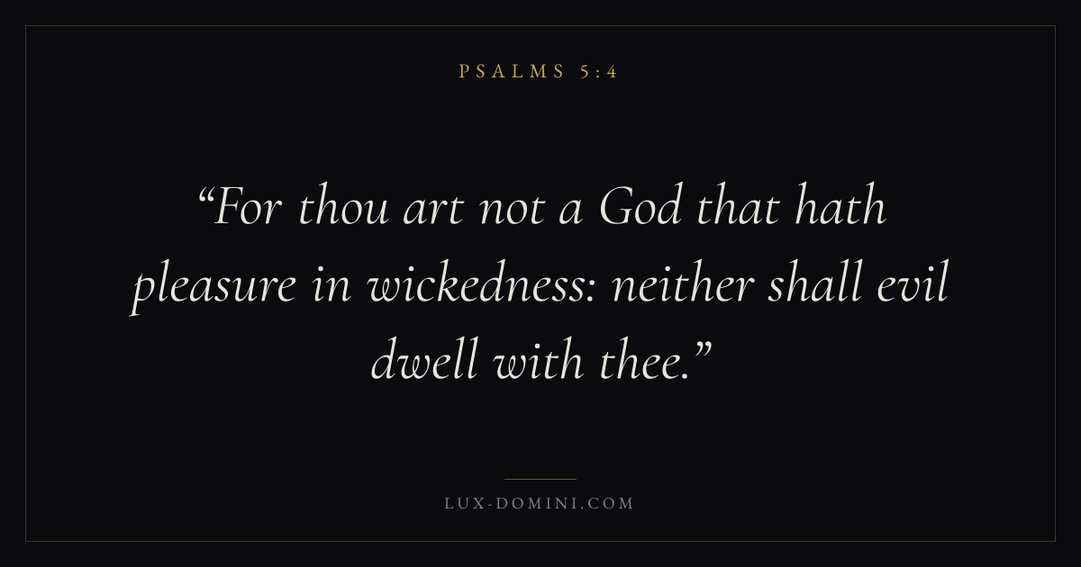Books / Psalms / Chapter 5 / Verse 4 ← Psalms 5:3 Psalms 5:4 Psalms 5:5 → For thou art not a God that hath pleasure in wickedness: neither shall evil dwell with thee. Download verse card Share on Twitter Share on Facebook Pin it ✦ Key themes FaithPrayerPeacePraise Read with Hebrews 11:1Romans 10:17Matthew 6:9Luke 18:1 Related topics Bible verses about faithBible verses about prayerBible verses about peaceBible verses about thankfulness and gratitude ✦ Psalms Chapter 5 verses V. 1 V. 2 V. 3 V. 4 V. 5 V. 6 V. 7 V. 8 V. 9 V. 10 V. 11 V. 12