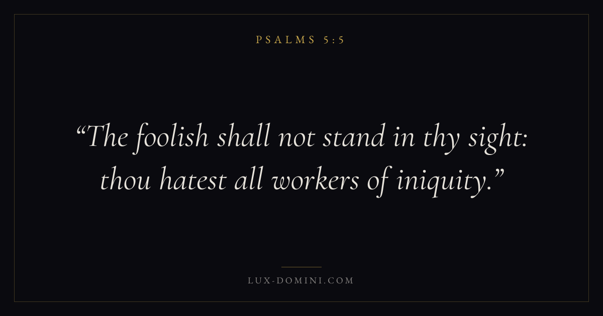 Books / Psalms / Chapter 5 / Verse 5 ← Psalms 5:4 Psalms 5:5 Psalms 5:6 → The foolish shall not stand in thy sight: thou hatest all workers of iniquity. Download verse card Share on Twitter Share on Facebook Pin it ✦ Key themes FaithPrayerPeacePraise Read with Hebrews 11:1Romans 10:17Matthew 6:9Luke 18:1 Related topics Bible verses about faithBible verses about prayerBible verses about peaceBible verses about thankfulness and gratitude ✦ Psalms Chapter 5 verses V. 1 V. 2 V. 3 V. 4 V. 5 V. 6 V. 7 V. 8 V. 9 V. 10 V. 11 V. 12