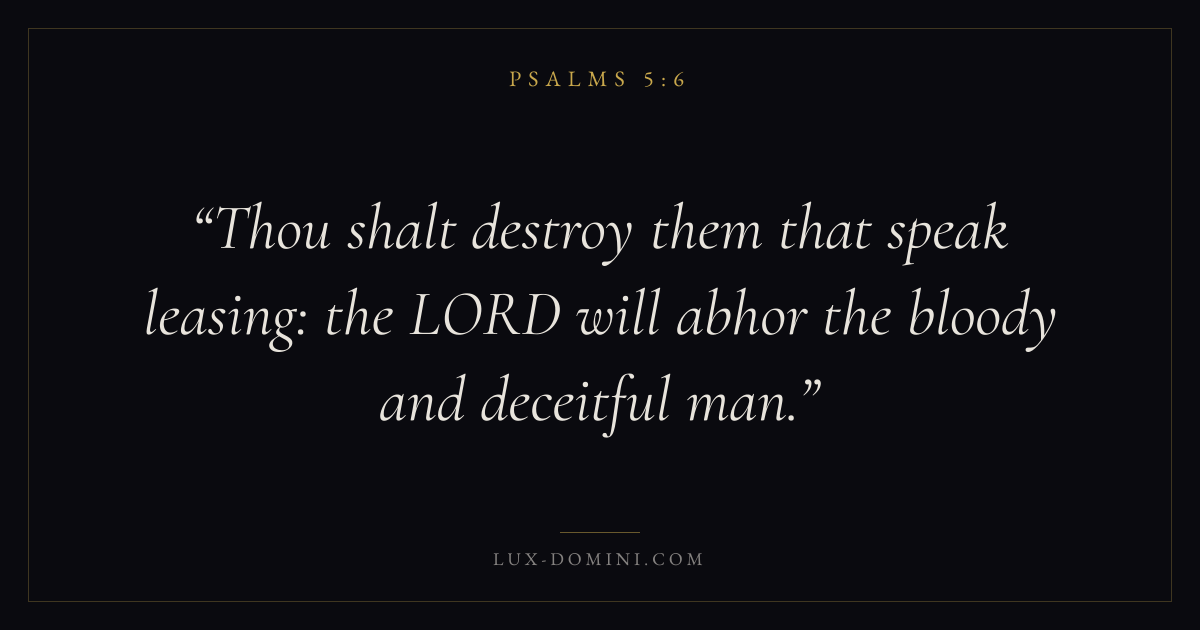 Books / Psalms / Chapter 5 / Verse 6 ← Psalms 5:5 Psalms 5:6 Psalms 5:7 → Thou shalt destroy them that speak leasing: the LORD will abhor the bloody and deceitful man. Download verse card Share on Twitter Share on Facebook Pin it ✦ Key themes FaithPrayerPeacePraise Read with Hebrews 11:1Romans 10:17Matthew 6:9Luke 18:1 Related topics Bible verses about faithBible verses about prayerBible verses about peaceBible verses about thankfulness and gratitude ✦ Psalms Chapter 5 verses V. 1 V. 2 V. 3 V. 4 V. 5 V. 6 V. 7 V. 8 V. 9 V. 10 V. 11 V. 12