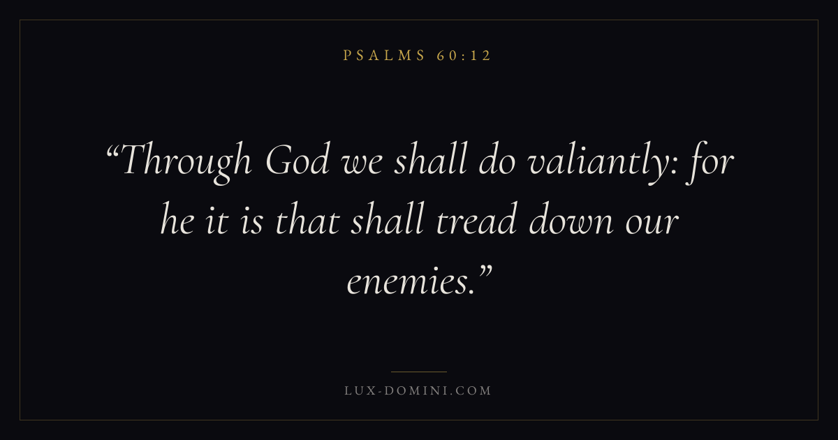Books / Psalms / Chapter 60 / Verse 12 ← Psalms 60:11 Psalms 60:12 Psalms 61:1 → Through God we shall do valiantly: for he it is that shall tread down our enemies. Download verse card Share on Twitter Share on Facebook Pin it ✦ Key themes FaithPrayerPraiseLament Read with Hebrews 11:1Romans 10:17Matthew 6:9Luke 18:1 Related topics Bible verses about faithBible verses about prayerBible verses about thankfulness and gratitudeBible verses about grief and loss ✦ Psalms Chapter 60 verses V. 1 V. 2 V. 3 V. 4 V. 5 V. 6 V. 7 V. 8 V. 9 V. 10 V. 11 V. 12