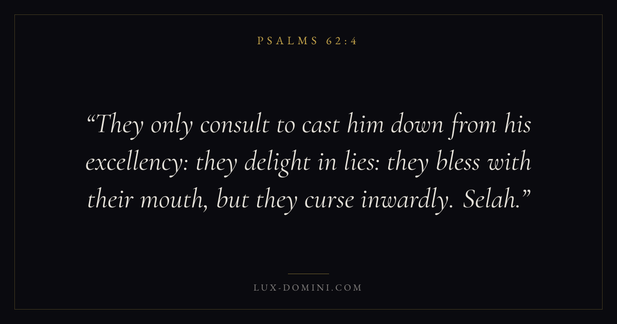 They only consult to cast him down from his excellency: they delight in lies: they bless with their mouth, but they curse inwardly. Selah.