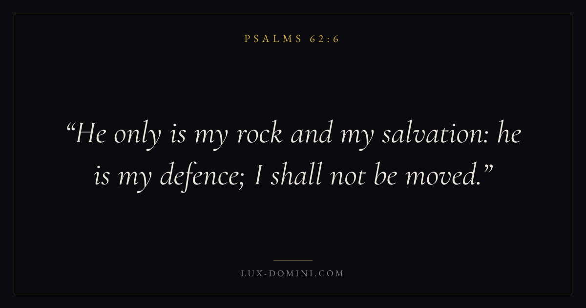 Books / Psalms / Chapter 62 / Verse 6 ← Psalms 62:5 Psalms 62:6 Psalms 62:7 → He only is my rock and my salvation: he is my defence; I shall not be moved. Download verse card Share on Twitter Share on Facebook Pin it ✦ Key themes FaithHopePrayerWisdomPraise Read with Hebrews 11:1Romans 10:17Romans 8:24Revelation 21:4 Related topics Bible verses about faithBible verses about hopeBible verses about prayerBible verses about wisdomBible verses about thankfulness and gratitude ✦ Psalms Chapter 62 verses V. 1 V. 2 V. 3 V. 4 V. 5 V. 6 V. 7 V. 8 V. 9 V. 10 V. 11 V. 12
