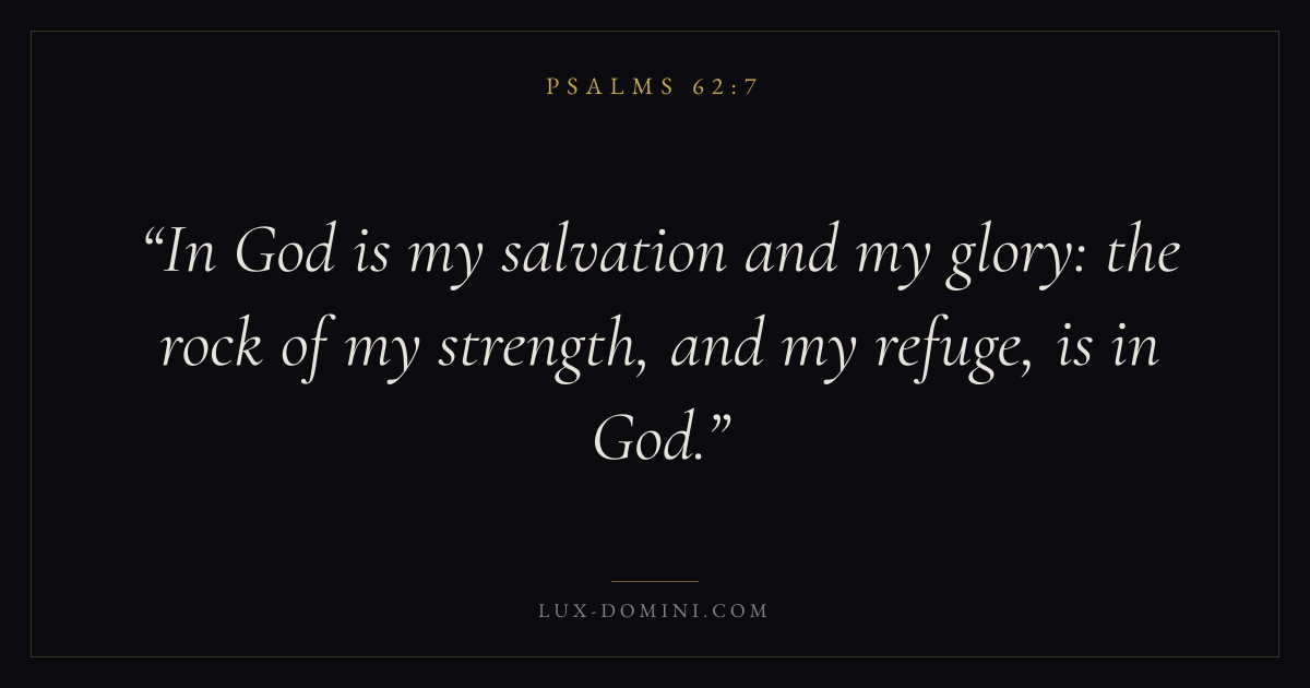Books / Psalms / Chapter 62 / Verse 7 ← Psalms 62:6 Psalms 62:7 Psalms 62:8 → In God is my salvation and my glory: the rock of my strength, and my refuge, is in God. Download verse card Share on Twitter Share on Facebook Pin it ✦ Key themes FaithHopePrayerWisdomPraise Read with Hebrews 11:1Romans 10:17Romans 8:24Revelation 21:4 Related topics Bible verses about faithBible verses about hopeBible verses about prayerBible verses about wisdomBible verses about thankfulness and gratitude ✦ Psalms Chapter 62 verses V. 1 V. 2 V. 3 V. 4 V. 5 V. 6 V. 7 V. 8 V. 9 V. 10 V. 11 V. 12