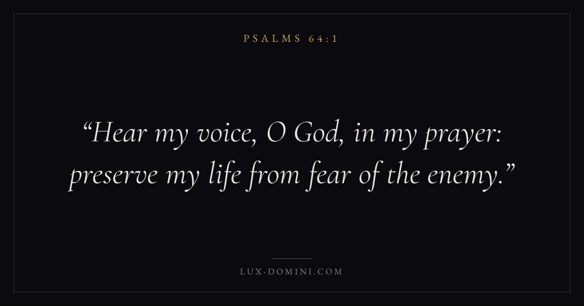 Books / Psalms / Chapter 64 / Verse 1 ← Psalms 63:11 Psalms 64:1 Psalms 64:2 → Hear my voice, O God, in my prayer: preserve my life from fear of the enemy. Download verse card Share on Twitter Share on Facebook Pin it ✦ Key themes FaithAnxiety and fearPrayerPraise Read with Hebrews 11:1Romans 10:17Philippians 4:6Isaiah 41:10 Related topics Bible verses about faithBible verses about anxiety and fearBible verses about prayerBible verses about thankfulness and gratitude ✦ Psalms Chapter 64 verses V. 1 V. 2 V. 3 V. 4 V. 5 V. 6 V. 7 V. 8 V. 9 V. 10