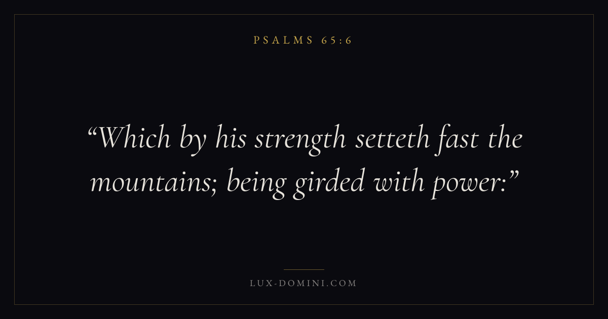 Books / Psalms / Chapter 65 / Verse 6 ← Psalms 65:5 Psalms 65:6 Psalms 65:7 → Which by his strength setteth fast the mountains; being girded with power: Download verse card Share on Twitter Share on Facebook Pin it ✦ Key themes FaithPrayerTruthPraise Read with Hebrews 11:1Romans 10:17Matthew 6:9Luke 18:1 Related topics Bible verses about faithBible verses about prayerBible verses about truthBible verses about thankfulness and gratitude ✦ Psalms Chapter 65 verses V. 1 V. 2 V. 3 V. 4 V. 5 V. 6 V. 7 V. 8 V. 9 V. 10 V. 11 V. 12 V. 13