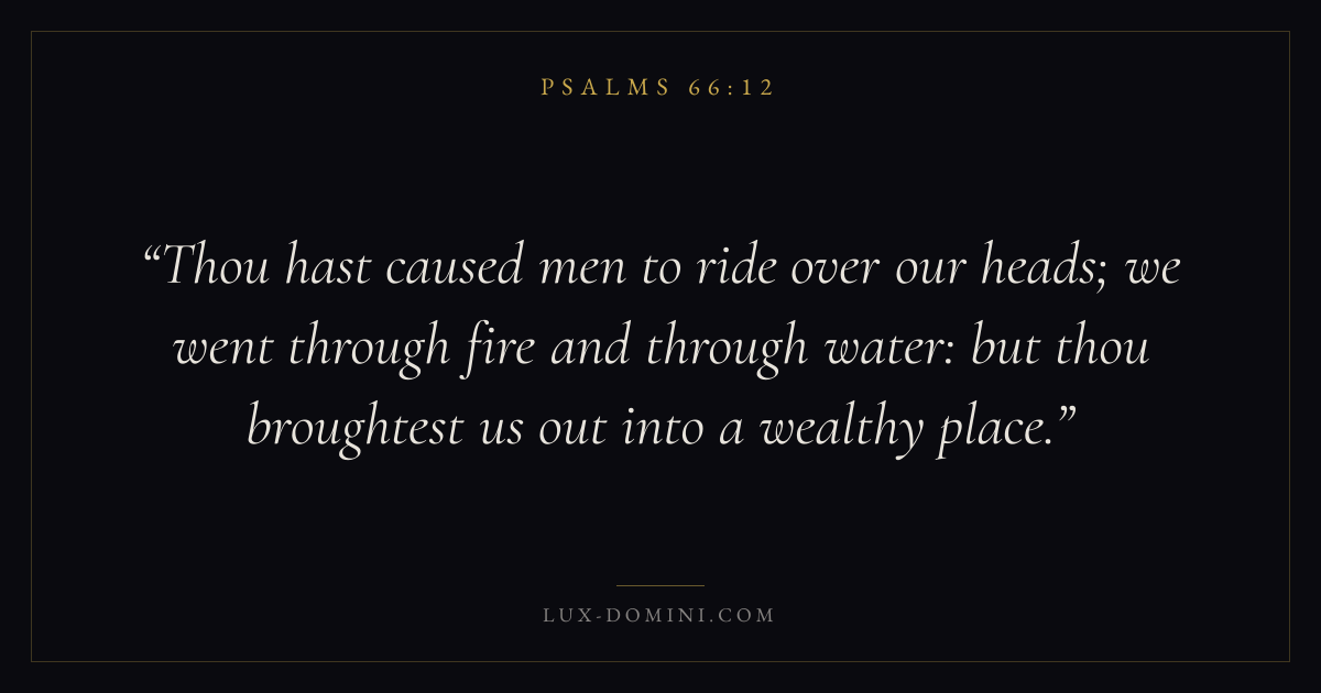 Thou hast caused men to ride over our heads; we went through fire and through water: but thou broughtest us out into a wealthy place.