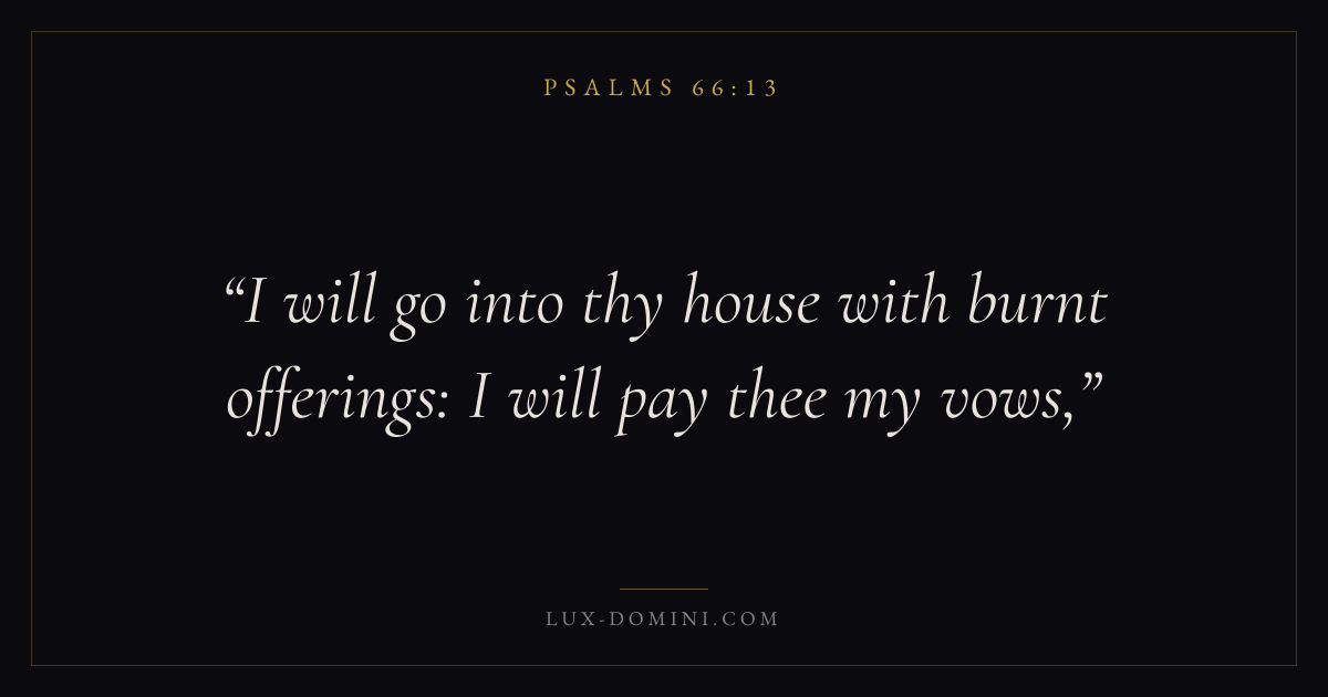 Books / Psalms / Chapter 66 / Verse 13 ← Psalms 66:12 Psalms 66:13 Psalms 66:14 → I will go into thy house with burnt offerings: I will pay thee my vows, Download verse card Share on Twitter Share on Facebook Pin it ✦ Key themes FaithAnxiety and fearPrayerPraise Read with Hebrews 11:1Romans 10:17Philippians 4:6Isaiah 41:10 Related topics Bible verses about faithBible verses about anxiety and fearBible verses about prayerBible verses about thankfulness and gratitude ✦ Psalms Chapter 66 verses V. 1 V. 2 V. 3 V. 4 V. 5 V. 6 V. 7 V. 8 V. 9 V. 10 V. 11 V. 12 V. 13 V. 14 V. 15 V. 16 V. 17 V. 18 V. 19 V. 20