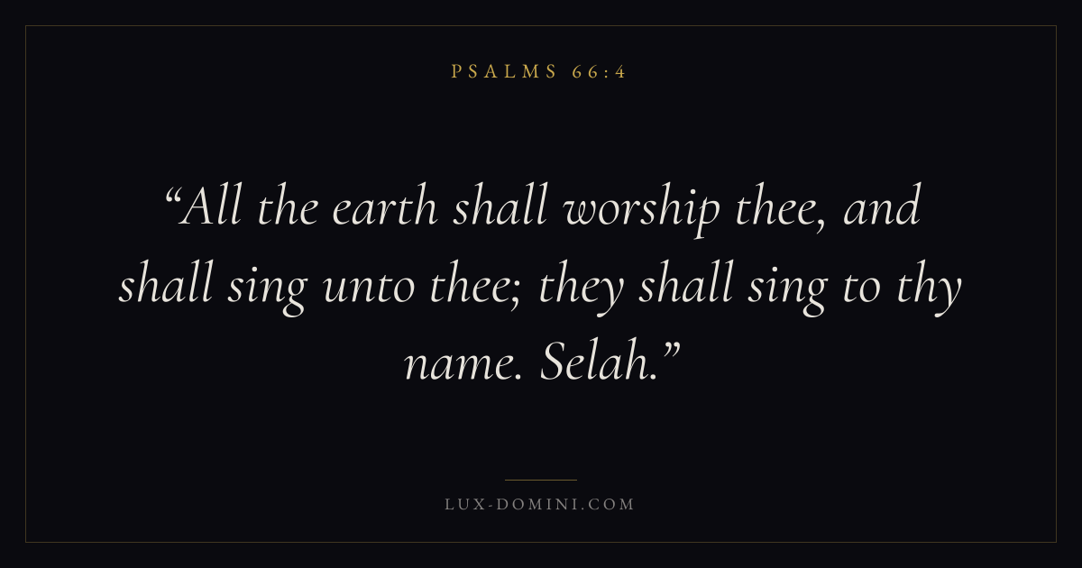 Books / Psalms / Chapter 66 / Verse 4 ← Psalms 66:3 Psalms 66:4 Psalms 66:5 → All the earth shall worship thee, and shall sing unto thee; they shall sing to thy name. Selah. Download verse card Share on Twitter Share on Facebook Pin it ✦ Key themes FaithPrayerTruthPraise Read with Hebrews 11:1Romans 10:17Matthew 6:9Luke 18:1 Related topics Bible verses about faithBible verses about prayerBible verses about truthBible verses about thankfulness and gratitude ✦ Psalms Chapter 66 verses V. 1 V. 2 V. 3 V. 4 V. 5 V. 6 V. 7 V. 8 V. 9 V. 10 V. 11 V. 12 V. 13 V. 14 V. 15 V. 16 V. 17 V. 18 V. 19 V. 20