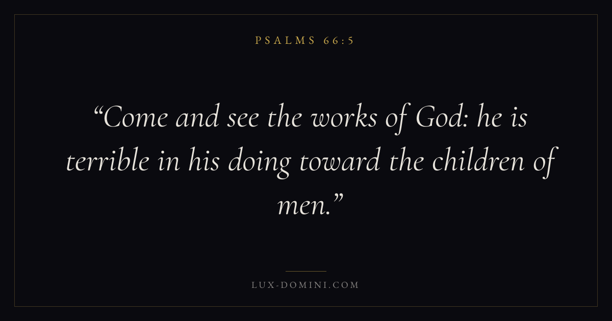 Books / Psalms / Chapter 66 / Verse 5 ← Psalms 66:4 Psalms 66:5 Psalms 66:6 → Come and see the works of God: he is terrible in his doing toward the children of men. Download verse card Share on Twitter Share on Facebook Pin it ✦ Key themes FaithPrayerTruthPraise Read with Hebrews 11:1Romans 10:17Matthew 6:9Luke 18:1 Related topics Bible verses about faithBible verses about prayerBible verses about truthBible verses about thankfulness and gratitude ✦ Psalms Chapter 66 verses V. 1 V. 2 V. 3 V. 4 V. 5 V. 6 V. 7 V. 8 V. 9 V. 10 V. 11 V. 12 V. 13 V. 14 V. 15 V. 16 V. 17 V. 18 V. 19 V. 20